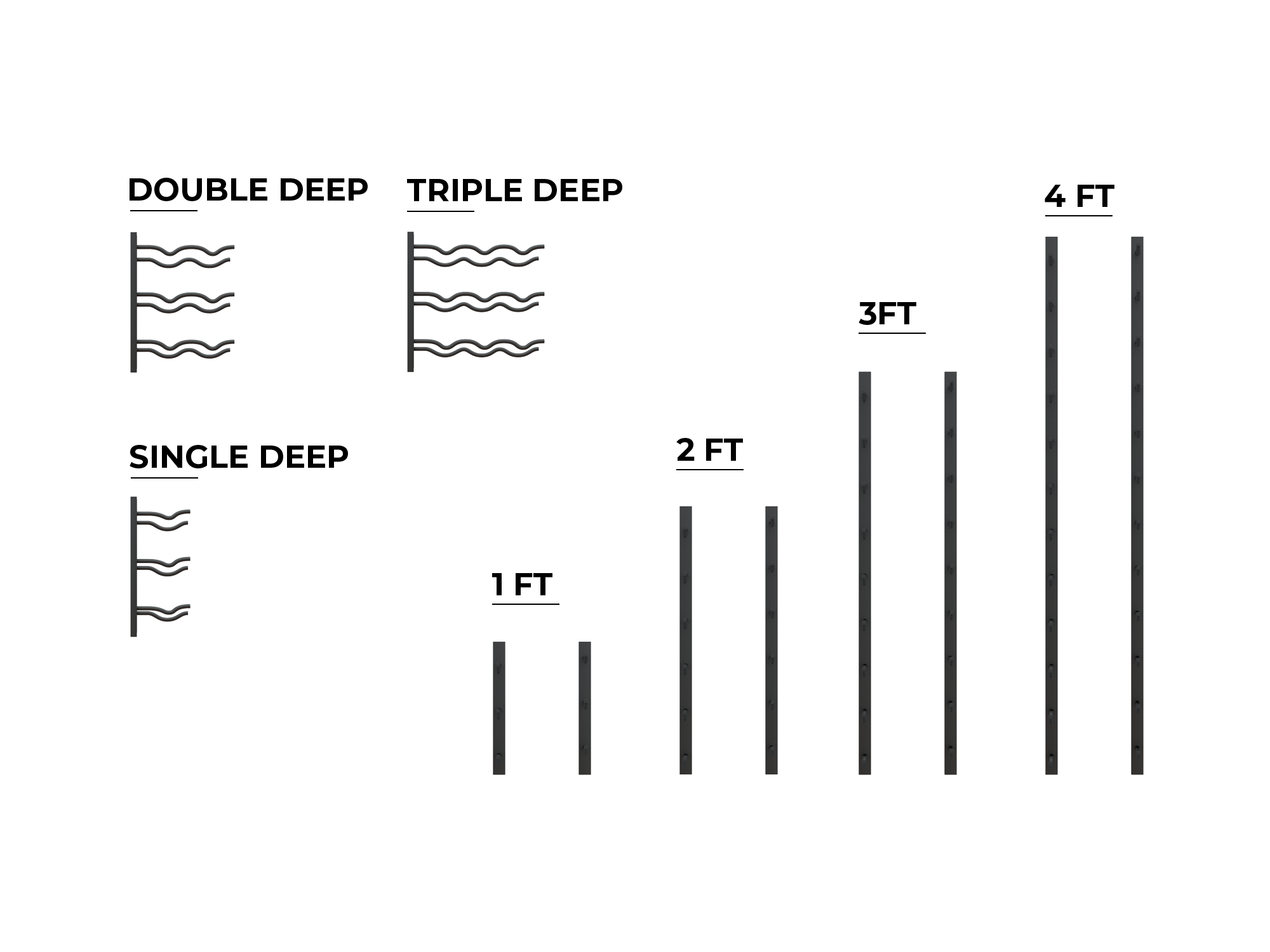E-Series wall rails are available in four rail heights (1 ft, 2 ft, 3 ft, and 4 ft) and three bottle depth options (single, double, and triple). Rails can be stacked vertically to create larger wine walls while increasing storage capacity. Our wall rails can hold 3-36 bottles on each metal wall wine rack.