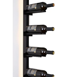 Each single-column V Bar provides everything needed to build a floating wine display for 12–36 standard bottles, depending on whether you select single, double, or triple-deep pegs. Bottles sit label-forward for a crisp, modern presentation.